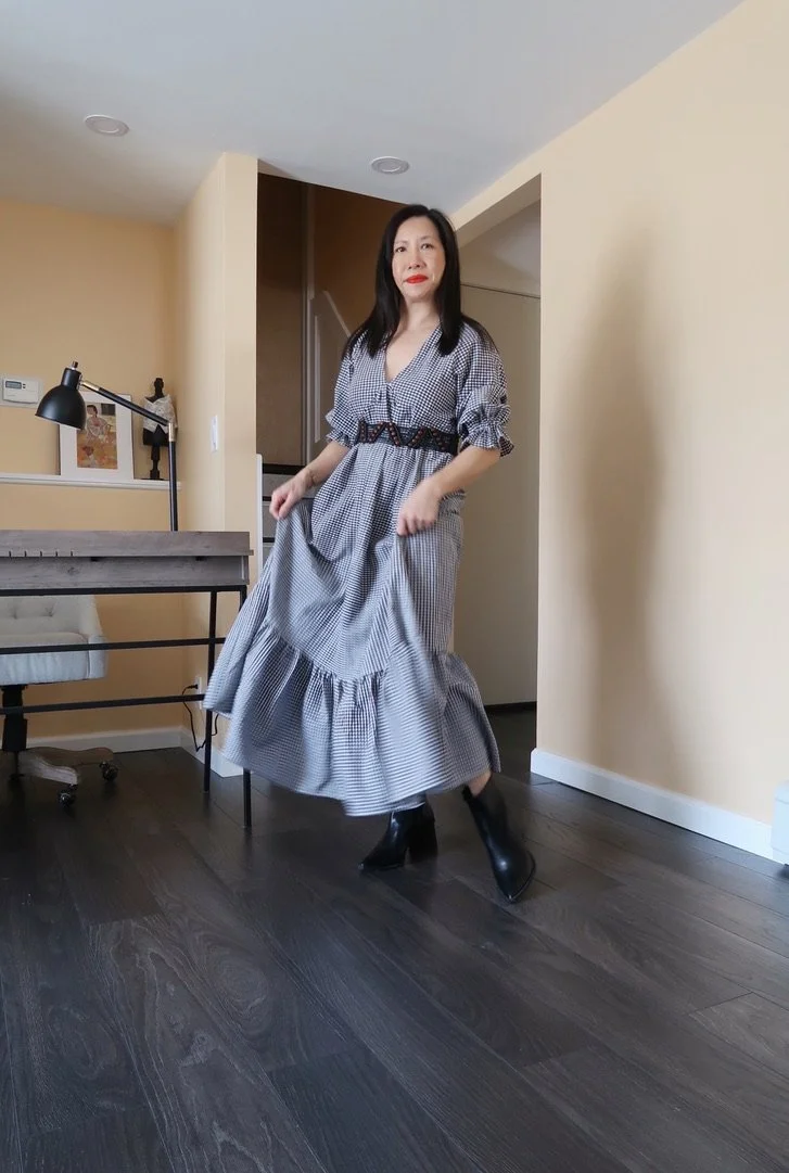 TIP 1: Use a tie belt or even a scarf belt. This will give you much more flexibility with how much of the dress fabric will “gather” once you have the desired “cinch,” avoiding the frustration of belt holes that are either too tight or too loose from one hole to the next. In case you were wondering…I also turned the “tied knot” of my belt to the back of the dress. ;-)